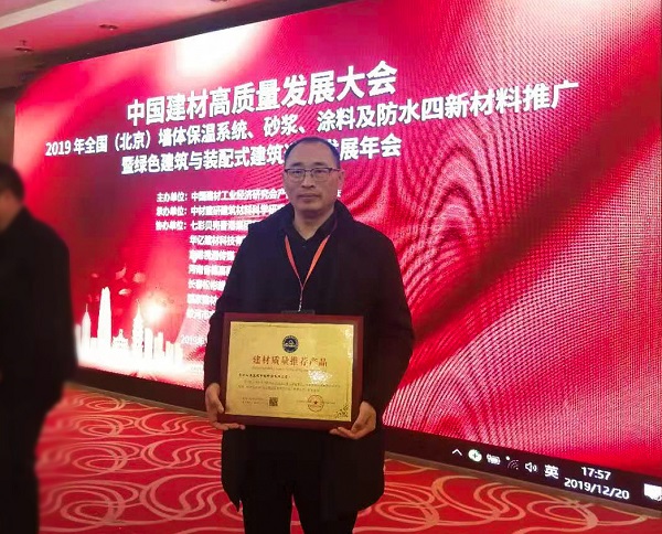 12月19-21日,“2019年全国(北京)墙体保温系统、砂浆、涂料及防水四新材料推广暨绿色建筑与装配式建筑选材发展年会”在北京召开。会上,贵州西奥的磷石膏抹灰砂浆经审核,被评为“2019年绿色建材质量推荐产品”。