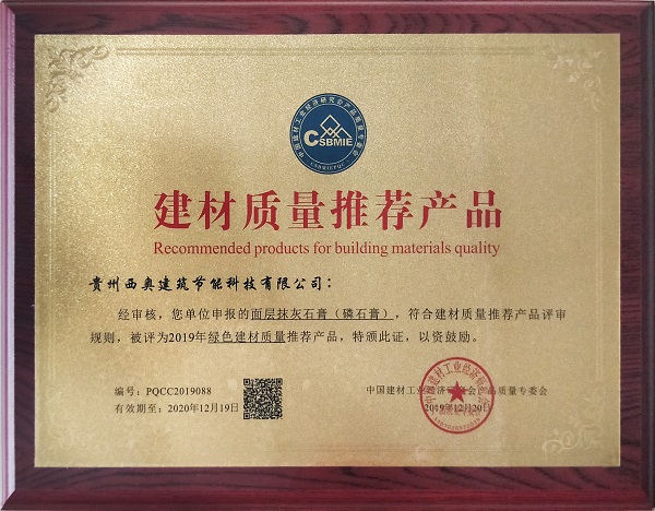 贵州西奥磷石膏砂浆被评为“全国绿色建材质量推荐产品”